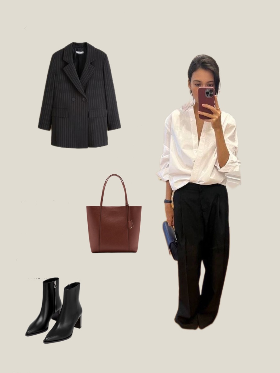 Обувь — ботинки на среднем каблуке цвета брюк или темно-коричневые. Сумка — структурированный тоут. В этом образе брюки задают основу, а светлый верх и цветовые акценты в деталях создают ощущение собранности.