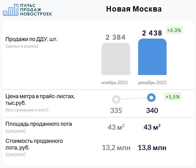 Декабрь 2025. Итоги продаж по ДДУ. 🏙 Сделки 2 438 сделок по ДДУ в декабре 2025 (+2,3% за месяц). 💰Цены и предложение На конец декабря средняя цена метра составила 340 тысяч рублей (+5 000 рублей за метр, без премиум и элит сегментов). На начало января (на сегодня) средневзвешенная цена метра растёт, 342 тысячи рублей. 🔸Цена метра в сделках с ДДУ выросла до 319 тысяч рублей (+13 тыс. рублей, +4,3%). Средний бюджет покупки вырос, в среднем 13,8 млн рублей за лот (+0,6 млн за месяц). Средняя площадь проданного по ДДУ лота в декабре - 43 м² (без изменений). 📈 Доля ипотечных сделок 86,0% (в ноябре было 78,0%). Смотрите детальные графики, топ девелоперов и старты продаж декабря на нашем сайте https://pulsprodaj.ru/news/dekabr-2025-moskva-novaia/ 🔥 @pulsprodaj