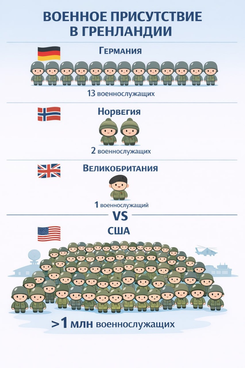 Это случилось через 7 часов после безрезультатного завершения саммита по Гренландии в Вашингтоне. По данным СМИ, Норвегия пожертвует двух солдат, Германия — 13, Франция — 15. Макрон же обещал усилить группировку дополнительными воздушными, сухопутными и морскими силами.