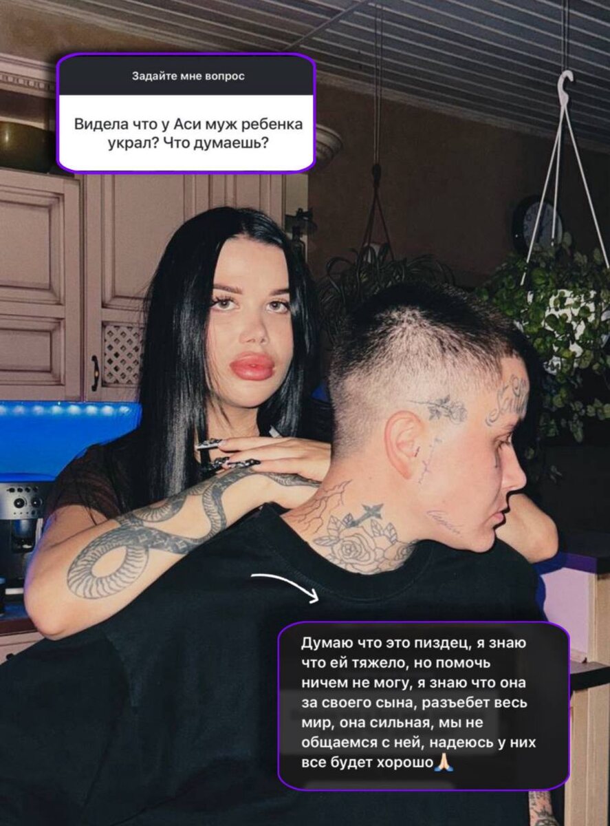 — Видела что у Аси муж ребенка украл? Что думаешь? Думаю что это пиздец, я знаю что ей тяжело, но помочь ничем не могу, я знаю что она за своего сына, разъебет весь мир, она сильная, мы не общаемся с ней, надеюсь у них все будет хорошо — Почему не общаешься с Асей? Потому что у нее и так дохуя проблем, я решила оставить её, мы сильно поругались. Будете скучать по их тандему?👇