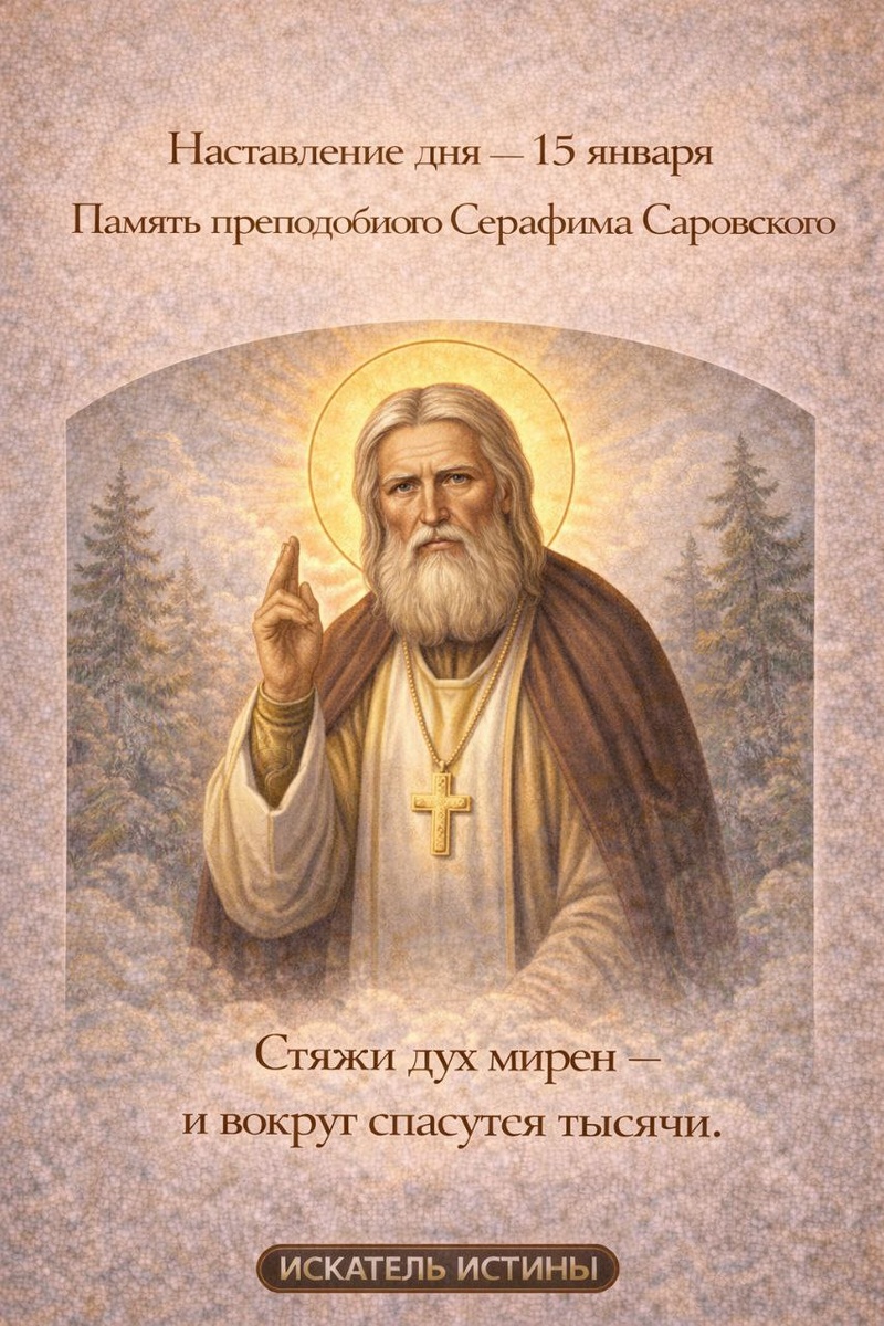 Память преподобного Серафима Саровского Преподобный Серафим Саровский учил прежде всего стяжанию мира в душе и любви ко всякому человеку. Он напоминал, что истинная радость рождается из молитвы, смирения и постоянного пребывания с Богом, а сердце, наполненное миром Христовым, способно согреть многих. Его жизнь свидетельствует: путь к святости начинается с простоты, терпения и доверия Божьему промыслу. Пусть и твой день будет наполнен тишиной сердца, радостью во Христе и миром, который не отнимается.