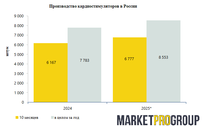 Наращиванию выпуска кардиостимуляторов в России способствуют курсы на импортозамещение и технологический суверенитет, которые стимулировали отечественных производителей к разработке устройств последнего поколения. Согласно данным исследования «Анализ рынка кардиостимуляторов в России в 2025 году» компании MarketProGroup, в 2025 году за первые 10 месяцев в стране было произведено 6,8 тыс кардиостимуляторов, что почти на 10% превысило объемы выпуска аналогичного периода 2024 года. По нашим оценкам, совокупный выпуск кардистимуляторов в России в целом за 2025 год составил порядка 8,5 тыс шт, в то время как в прошлом году этот показатель составлял 7,8 тыс шт. Курс на импортозамещение является одним из главных драйверов российского производства на рынке. Госкорпорация «Ростех» к 2025 году не просто нарастила объёмы выпуска кардиостимуляторов, но и вышла на качественно новый уровень, запустив серийное производство первого отечественного МРТ-совместимого электрокардиостимулятора. Это устройст