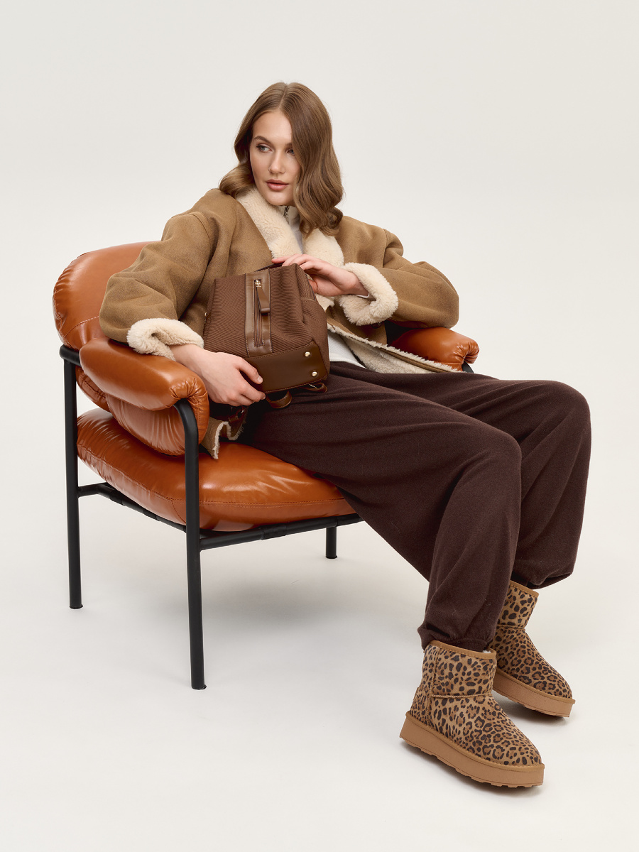 Анималистичный принт — это не просто модный приём, а уверенное заявление о стиле. Когда обувь становится центральным элементом образа, она задаёт настроение, цветовую палитру и характер всего ансамбля. Леопардовые угги из натуральной замши выглядят эффектно и при этом остаются универсальными. Благородная фактура материала смягчает активный принт, делая его уместным даже в повседневных образах. Внутри — плотная меховая подкладка с добавлением шерсти, которая дарит тепло и комфорт в холодную погоду. Такая модель легко становится акцентом, вокруг которого выстраивается весь образ. Чтобы поддержать идею продуманного стиля, стилисты советуют дополнить угги рюкзаком шоколадного оттенка. Он гармонирует с анималистичным принтом и добавляет образу глубины. Практичная модель с двумя вместительными отделениями и карманами разного объёма позволяет удобно организовать всё необходимое — без компромиссов между стилем и функциональностью. Достаточно одного яркого элемента и продуманных деталей, чтобы