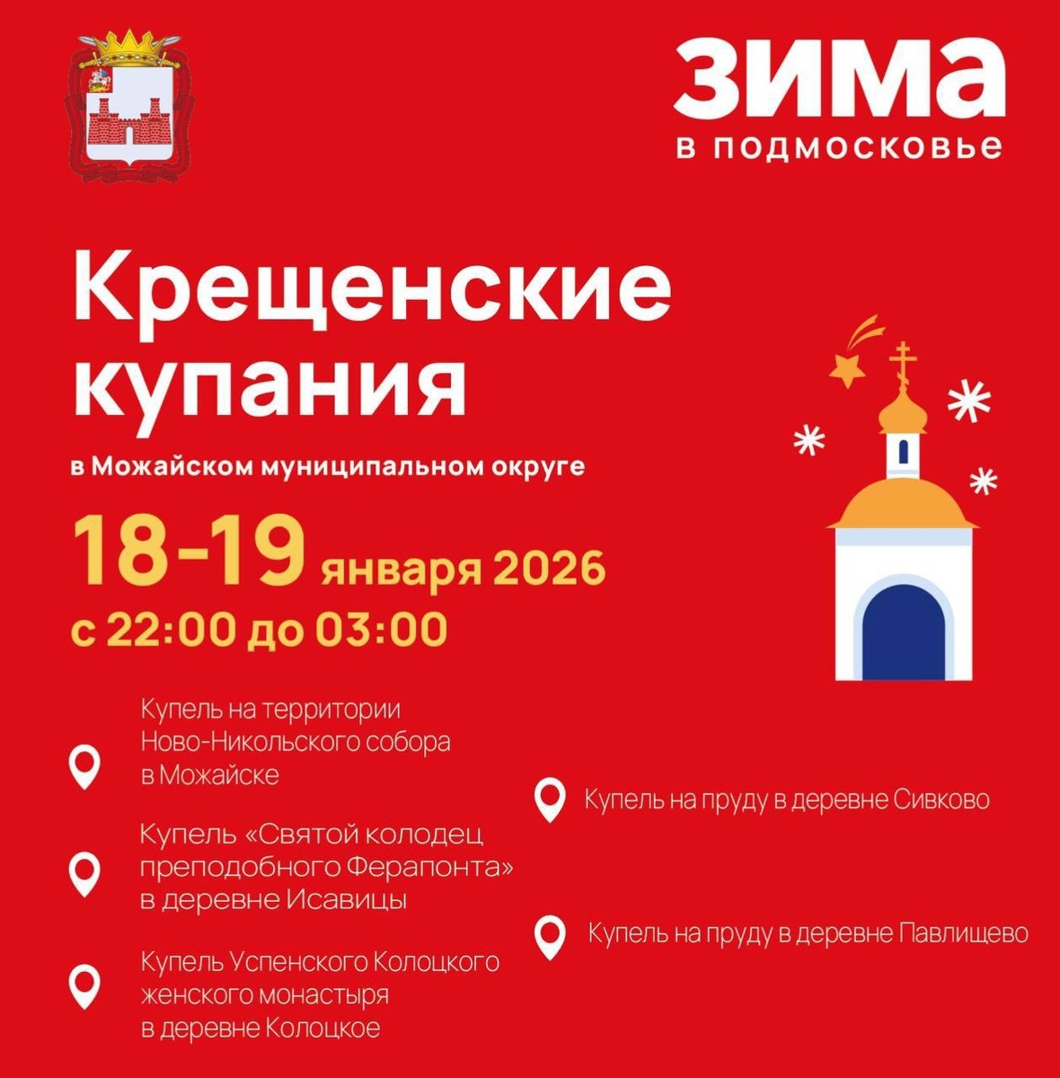 : 🪨Купель на территории Ново-Никольского собора в Можайске Открытие с 00:00 19 января 🪨Купель «Святой колодец преподобного Ферапонта» в деревне Исавицы Открытие с 22:00 18 января 🪨Купель Успенского Колоцкого женского монастыря в деревне Колоцкое Открытие с 22:00 18 января 🪨Купель на пруду в деревне Сивково Открытие с 22:00 18 января 🪨Купель на пруду в деревне Павлищево Открытие с 22:00 18 января С 21:00 18 января до 03:00 19 января будет перекрыто автомобильное движение от Лужецкого Ферапонтова монастыря до д. Исавицы д.1. До купели в деревне Исавицы и обратно будет курсировать комфортабельный автобус. С 23:00 18 января до 03:00 19 января будет перекрыто автомобильное движение на улице Бородинская (до входа на территорию Ново-Никольского собора).