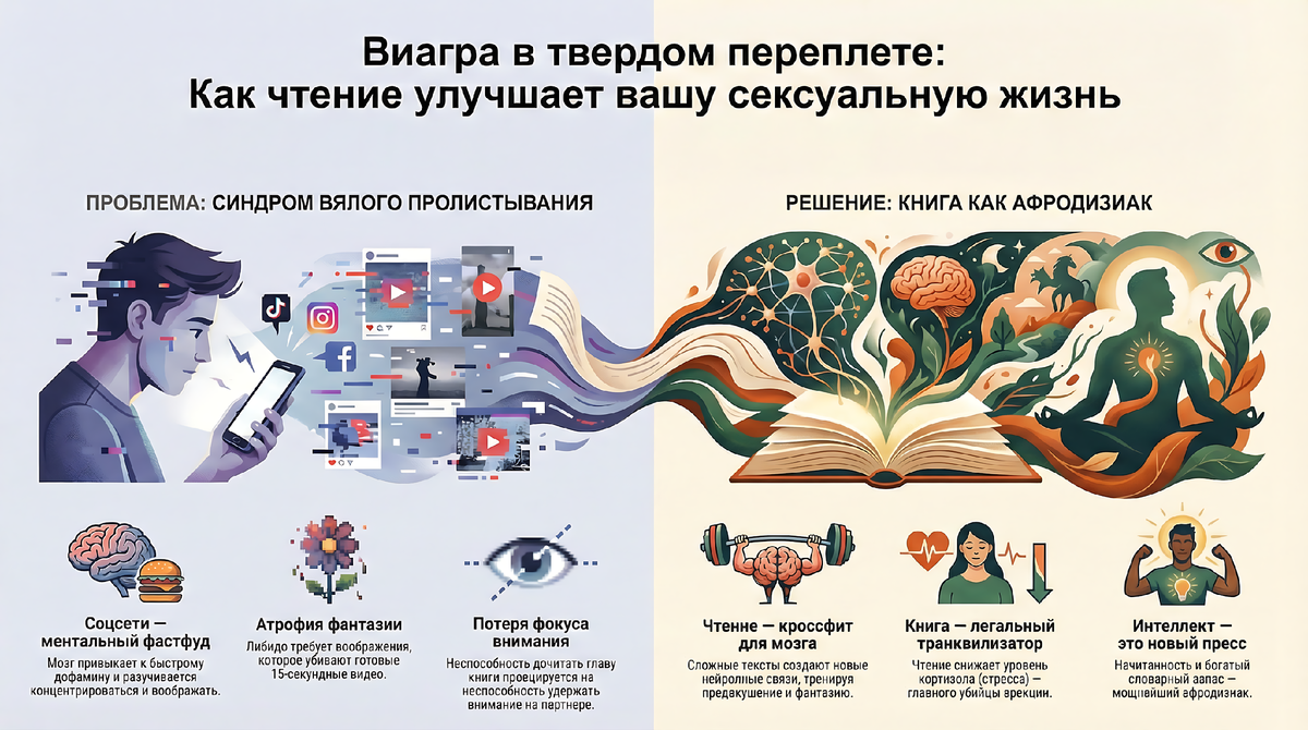 Вы, конечно, ждали, что я начну с цитаты великих или скучной статистики ВОЗ. Не дождетесь. Давайте сразу к делу, без прелюдий — мы же тут все взрослые люди, хотя и ведем себя порой как подростки в пубертате, дорвавшиеся до безлимитного интернета. В современном мире, где каждый второй — биохакер, а каждый первый — эксперт по выгоранию, мы умудрились потерять главное. И я сейчас не про духовность. Я про элементарную физиологию, которая, как выяснилось, намертво прикручена к интеллекту. Вот вам парадокс: мы качаем ягодицы, пьем цинк ведрами и медитируем на успешный успех, но в спальне всё чаще случается «фиаско». А ларчик просто открывался. Точнее, открывалась книга. Синдром вялого пролистывания Смотрите, какая штука. Наш мозг — это ленивая скотина. Ему подавай быстрый дофамин, как фастфуд на вокзале. Соцсети, рилсы, тиктоки — это ментальный сахар. Вы свайпаете, нейроны вспыхивают, гаснут, и вы снова свайпаете. Процесс потребления контента стал короче — некуда. И тут начинается самое инт