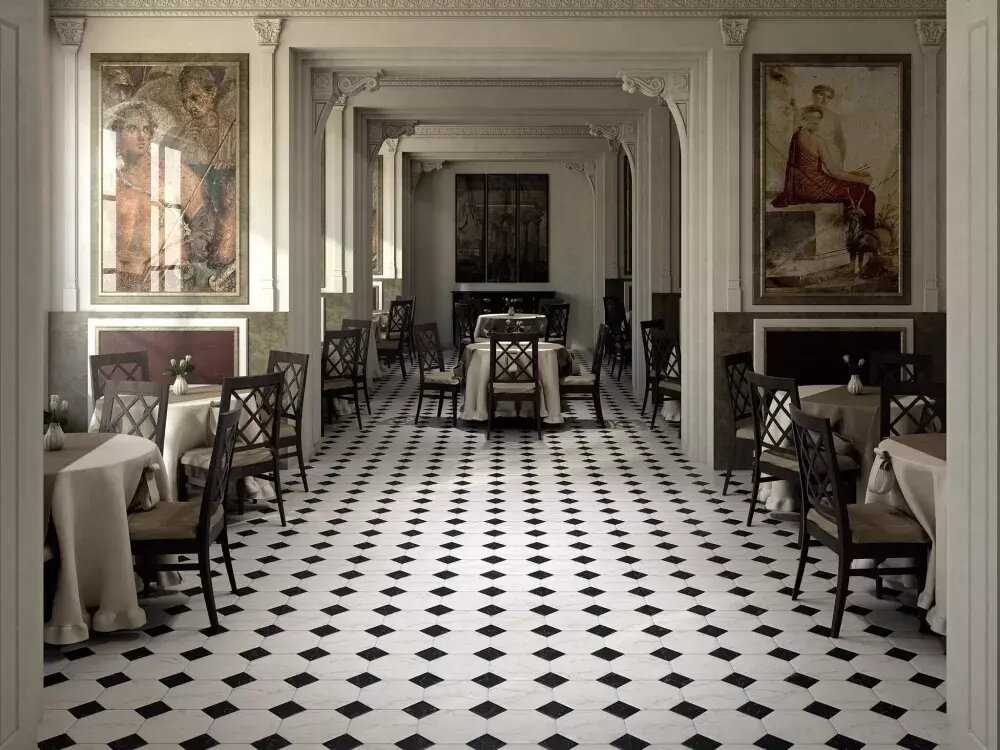 Считаете, что чёрно-белый интерьер – это только для офисов и глянцевых журналов? А если всё наоборот? Рассказываем, почему 5 самых популярных мифов о монохроме давно не работают. Кажется, о чёрно-белых интерьерах уже всё сказано: они строгие, холодные, скучные. Но стоит один раз войти в такое пространство – и все стереотипы рушатся. Потому что чёрно-белое – не про отсутствие цвета, это про смысл. Хотите доказательств? Тогда давайте развенчаем популярные мифы. Миф № 1. Чёрно-белый интерьер – это холодно Дело в том, что тепло создают не цвета, а фактура и свет. Серия «Коррер» легко доказывает это: рисунок мрамора здесь мягкий, с естественными прожилками, а глянцевая поверхность отражает свет и визуально расширяет пространство. Для стен предусмотрено несколько решений: фоновая плитка и декоры с геометрическим орнаментом в формате 30х60 см. Размер универсальный – между малым и крупным, поэтому интерьер выглядит собранным. Белая плитка в ванной из этой серии не холодит – она создаёт ощущени