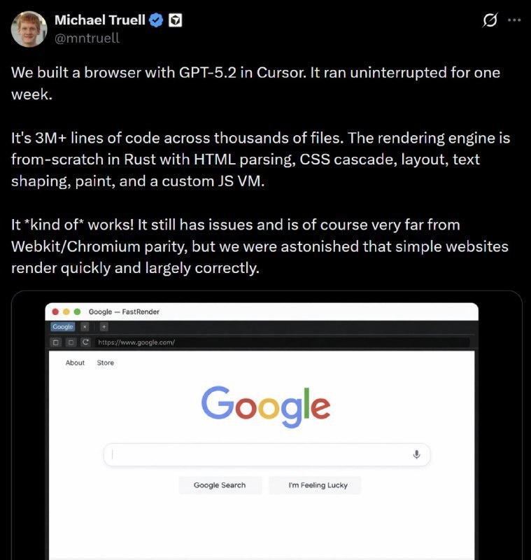 Гендир Cursor рассказал, что собрал команду ИИ-агентов GPT-5.2 и поручил им с нуля написать софт для интернет-сёрфинга. Итог оказался неожиданно жёстким: за 7 дней нейронки выдали больше 3 миллионов строк кода и полностью закрыли задачу. «Сотни агентов могут параллельно работать над одной кодовой базой неделями и реально двигать сложные проекты вперёд». Google Chrome слегка напрягся 😱 Подробнее: https://hard-tm.su/threads/140657/ 🕹HARD-TM — Подписаться