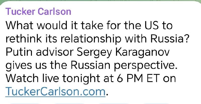Такер Карлсон сообщает, что сегодня будет опубликовано его интервью с Сергеем Карагановым - одним из виднейших российских аналитиков