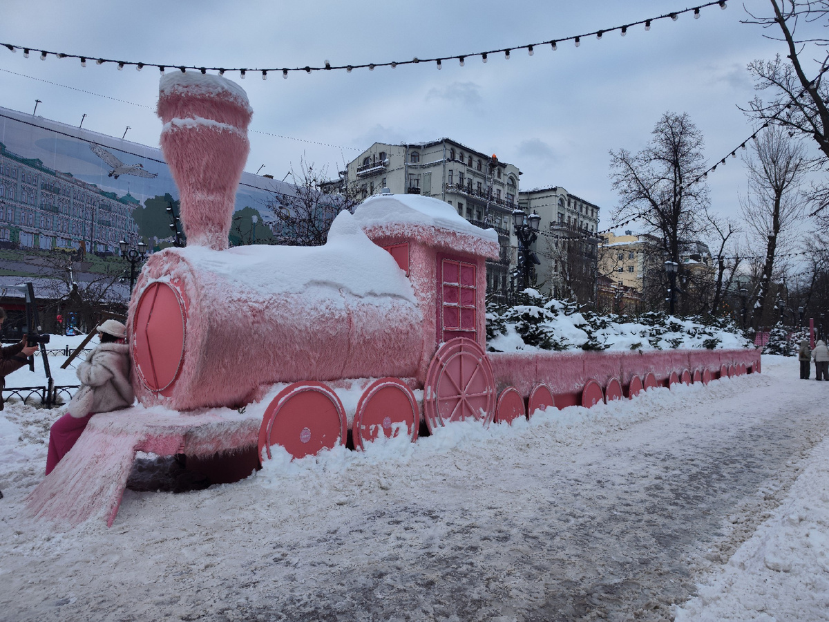 Одним из главных героев праздничного бульвара стал розовый пушистый паровозик. Он выглядит так, будто его собрали из снега, меха и детских мечтаний. Возле него почти всегда очередь — семьи, пары и компании друзей терпеливо ждут своей минуты, чтобы сделать фото на фоне этого необычного новогоднего чуда. Паровозик стал настоящей точкой притяжения и символом праздника.