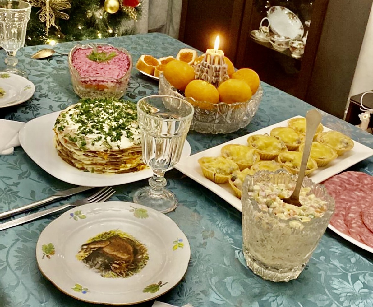 - Праздничная выпечка и жареное мясо: Жареный гусь или утка, свиной окорок, жареные пирожки, пончики.
