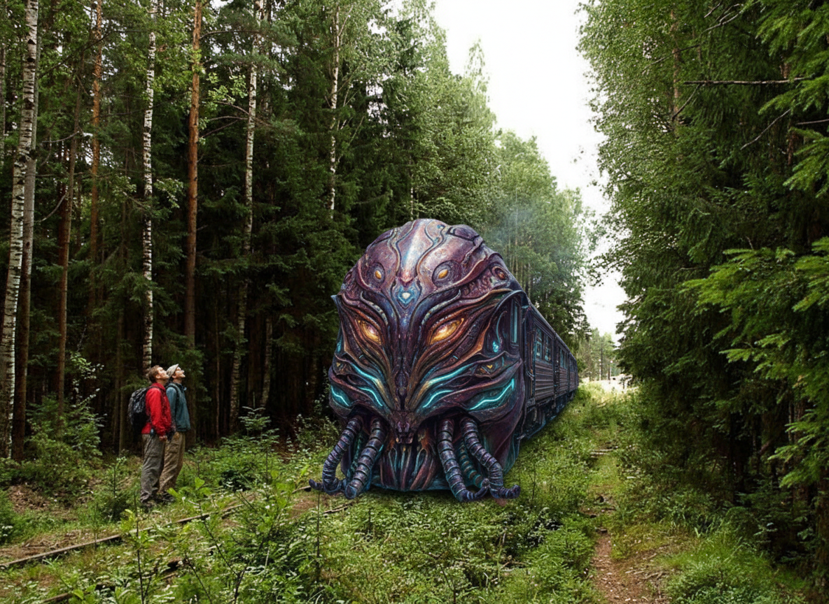 Парни рассказывали, что, когда они были в лесу недалеко от Свердловска, случайно наткнулись на старую железную дорогу. Они пошли по ней, но вскоре услышали странный звук, и земля под ногами задрожала. Через несколько десятков секунд из-за деревьев показалась необычная машина, похожая на поезд. Состав состоял из нескольких вагонов, которые по виду напоминали обычные, но первый вагон — точнее, его кабина — выглядел совершенно иначе: словно современный тюнинг, выполненный в стиле какого-то страшного существа.