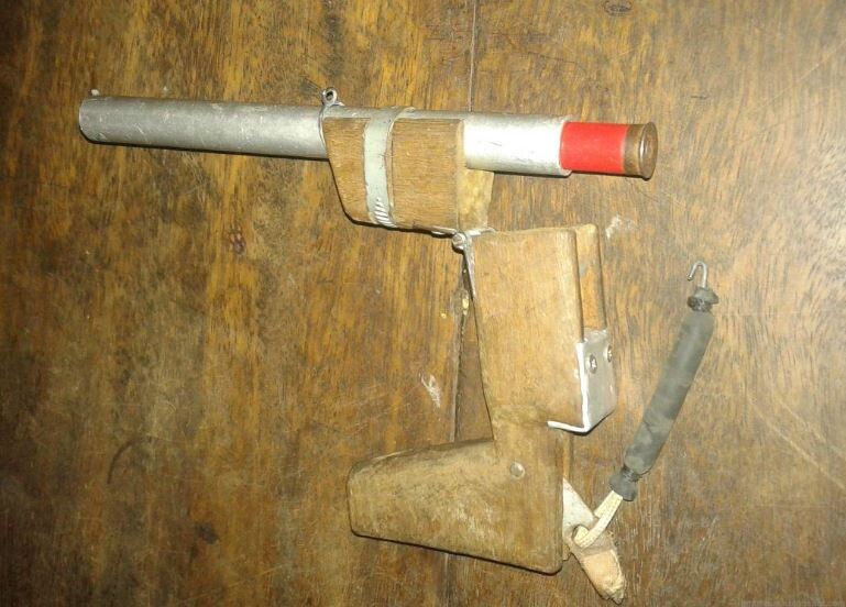 Данные материалы публикуются в исторических и развлекательных целях, и никаким образом не являются руководством к действию и примером для подражания. Несколько очередных примеров как из того, что нашлось под рукой можно сделать мир лучше. Потому что добрым словом и дробовиком можно добиться больше, чем только добрым словом. Подписывайтесь на наш канал в Telegram, чтобы получать больше материалов о необычном вооружении и военных технологиях. Два куска дерева понадобились для того, чтобы вырезать из них ложу и рукоятку. Затем их соединили при помощи форточной петли, получив классическую переломную конструкцию. На ложе закрепили ствол из алюминиевой трубки. А в рукоятке соорудили назамысловатый казённик с отверстием для того, чтобы ударник добрался таки до капсюля патрона. В собранном положении всю конструкцию удерживает резиновый элемент, похоже сделанный из велосипедной камеры. Один её конец крепится к специальной петле из проволоки, накрученной на стволе. А другим концом крепится н