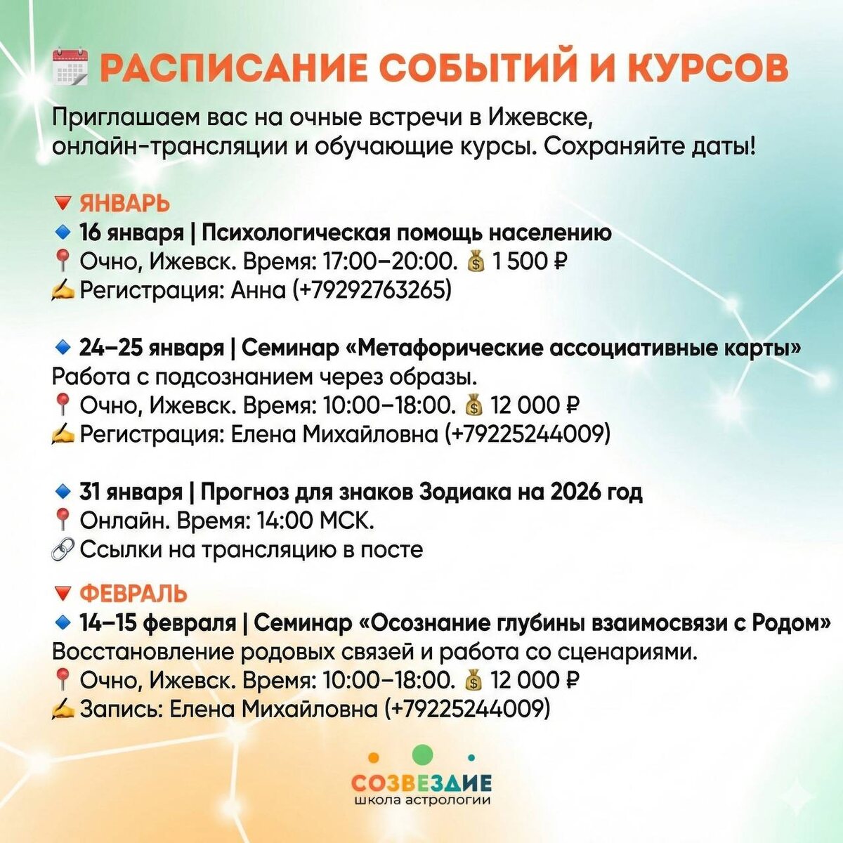 Приглашаем вас на очные встречи в Ижевске, онлайн-трансляции и обучающие курсы. Сохраняйте даты! 🔻 ЯНВАРЬ 🔹 16 января | Психологическая помощь населению 📍 Очно, Ижевск. Время: 17:00–20:00. 💰 1 500 ₽ ✍️ Регистрация: Анна (+79292763265) 🔹 24–25 января | Семинар «Метафорические ассоциативные карты» Работа с подсознанием через образы. 📍 Очно, Ижевск. Время: 10:00–18:00. 💰 12 000 ₽ ✍️ Регистрация: Елена Михайловна (+79225244009) 🔹 31 января | Прогноз для знаков Зодиака на 2026 год 📍 Онлайн. Время: 14:00 МСК. 🔗 Ссылки на трансляцию (ВК/YouTube): • https://vkvideo.ru/video-43454344_456242330 • https://www.youtube.com/live/RBsWNMCw_PM 🔻 ФЕВРАЛЬ 🔹 14–15 февраля | Семинар «Осознание глубины взаимосвязи с Родом» Восстановление родовых связей и работа со сценариями. 📍 Очно, Ижевск. Время: 10:00–18:00. 💰 12 000 ₽ ✍️ Запись: Елена Михайловна (+79225244009) 🎓 СТАРТ ОБУЧАЮЩИХ КУРСОВ 🖥️ Формат: Онлайн и Очно 🔸 3 марта — Основы медицинской астрологии Лектор: Саитзянова Е.М. 🔥