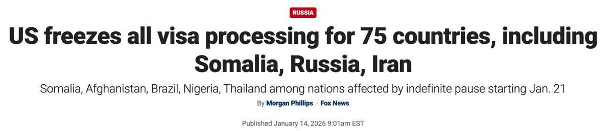 Всего в списке - 75 стран. Среди них: Россия, Афганистан, Бразилия, Иран, Ирак, Египет, Нигерия, Таиланд и другие. В записке консульским сотрудникам предписывается с 21 января отказывать в выдаче виз гражданам этих стран, пока департамент пересматривает процедуры проверки и отбора кандидатов. Сколько продлится эта процедура, пока неизвестно. 🤗 НАСОНОВ 🔴