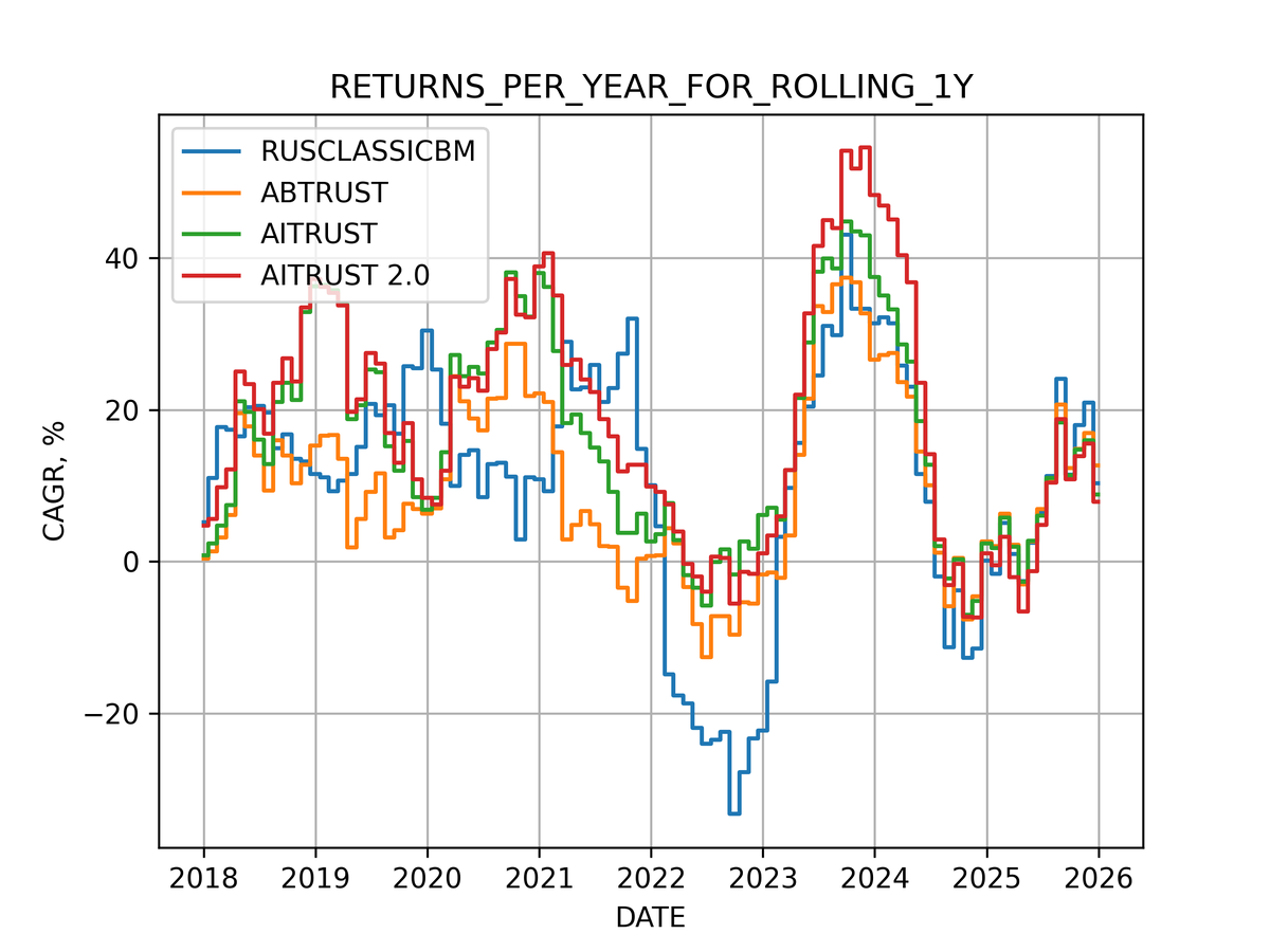 Я уже не раз писал на эту тему, и не раз приводил примеры в пользу долгосрочных инвестиций. Но бывает не лишним повторить! Я не видел ни одной долгосрочной стратегии (будь то фонд, автоследование или ещё какой вариант), которые из года в год на длинном горизонте показывали бы результат лучше какого-нибудь классического бенчмарка. Под классическим бенчмарком я понимаю набор индексных фондов в определённой пропорции (например, 60% индексного фонда акций и 40% индексного фонда облигаций). И это нормально. Куда важнее, чтобы на более длительном горизонте желательно получать доходность выше, чем такой бенчмарк. Конечно, это сложно, особенно на таких рынках, как американский. На данных графиках приведен пример расчёта доходности в процентах годовых в скользящем окне длиной 1 год (график 1), 3 года (график 2) и 5 лет (график 3) для стратегий ABTRUST, AITRUST, AITRUST 2.0 в сравнении как раз с классическим бенчмарком RUSCLASSICBM*. Несложно увидеть (график 1), что стратегии на горизонте в 1 го