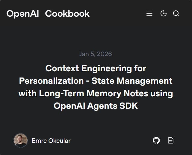 OpenAI добавили в свой cookbook гайд по Context Engineering для Agents SDK, и это, пожалуй, самый грамотный подход к управлению памятью. Вместо того чтобы рыться в тысячах старых сообщений, агент ведет структурированный профиль пользователя и "записную книжку". 🟡Как это устроено 🟢State Object: центр сведений в виде JSON-объекта, который хранится локально. В нем есть profile (жесткие факты: имя, ID, статус лояльности) и notes (неструктурированные заметки: "любит отели в центре"). 🟢Injection: перед каждым запуском этот стейт скармливается в системный промпт в YAML-формате: для профиля и Markdown для заметок. Не все подряд, конечно, а только то, что нужно сейчас. 🟢Distillation: самое интересное. Агент не просто болтает, у него есть тул save_memory_note. Если в разговоре вы сказали: "Я не ем мясо", агент вызывает этот тул и сохраняет Session Note (временную заметку) в реальном времени. 🟢Consolidation: сборка мусора для памяти. После завершения сессии запускается отдельный процес