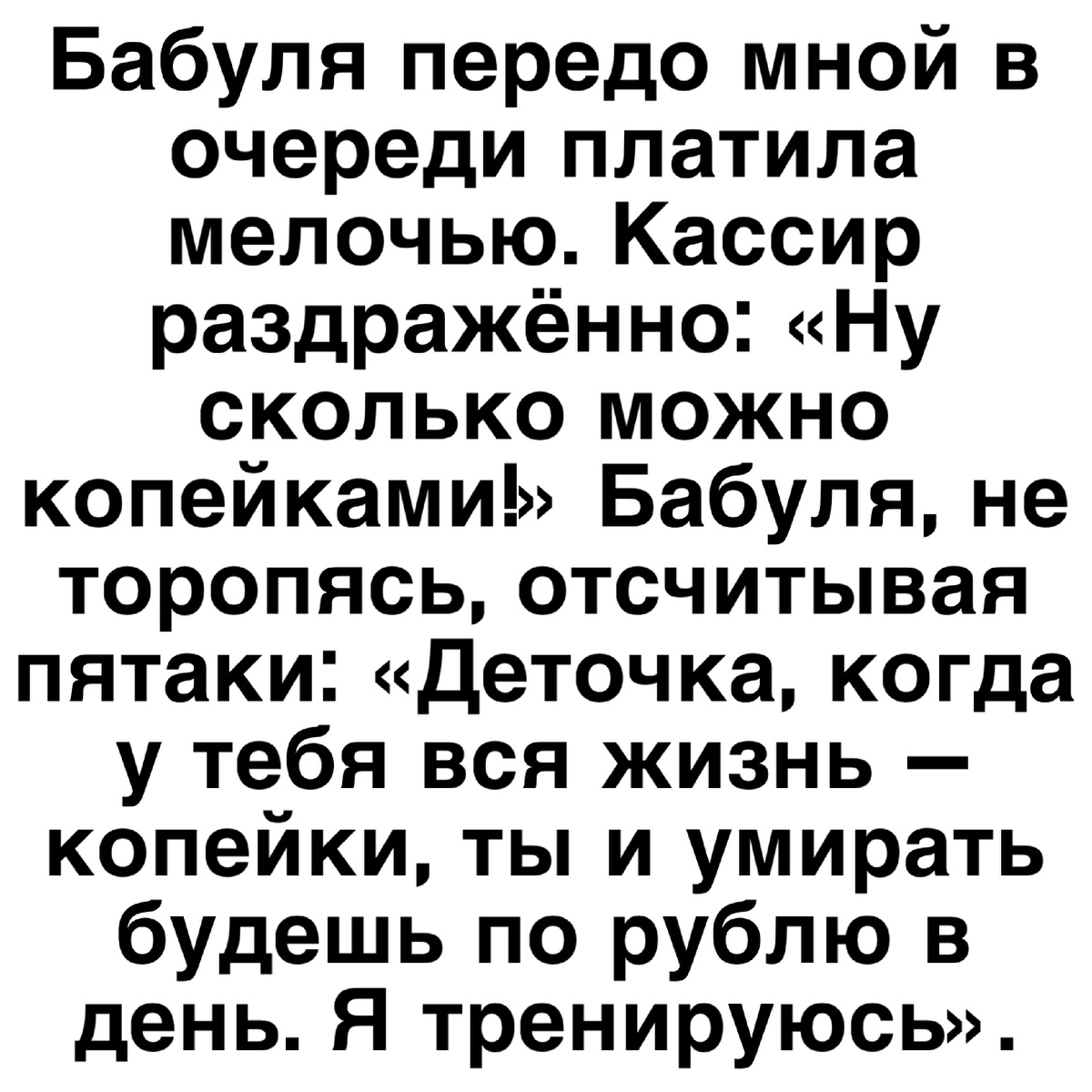 Бабуля передо мной в очереди платила мелочью. Кассир раздражённо: «Ну сколько можно копейками!» Бабуля, не торопясь, отсчитывая пятаки: «Деточка, когда у тебя вся жизнь — копейки, ты и умирать будешь по рублю в день. Я тренируюсь».