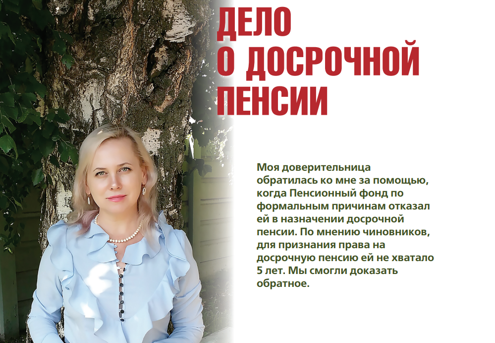 По мнению чиновников Пенсионного фонда, для признания за моей доверительницей права на досрочную пенсию ей не хватало 5 лет.