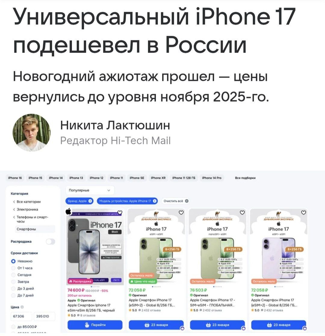Цена iPhone 17 снизилась до 72 тысяч рублей. В начале января устройство стоило 82 тысячи рублей на фоне новогоднего спроса и повышенного НДС. • Снижение составило 10 тысяч рублей. • Причиной роста цены ранее был ажиотаж и налоговая нагрузка. Стоимость смартфона вернулась к более низкому уровню после праздников. https://dzen.ru/id/5c0e38ff46ef5c00aaa80527