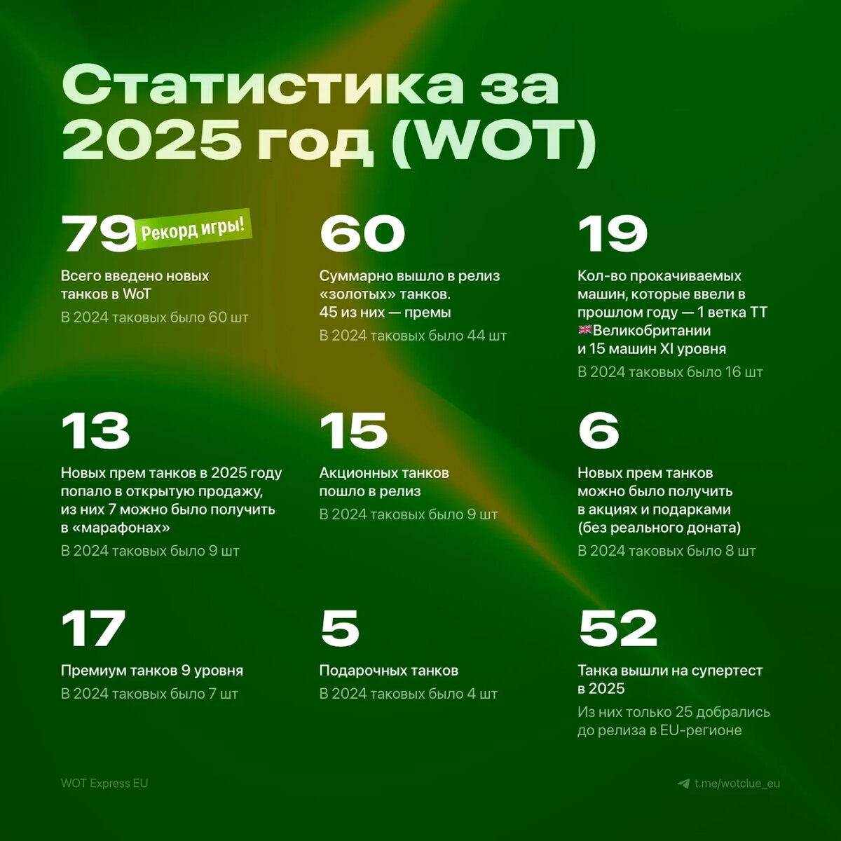 В прошлом году в релиз вышло 79 танков — новый рекорд за всё время наблюдений. 2025 год стал самым масштабным по количеству введённой техники, в том числе за счёт добавления XI уровней. Мы как минимум ожидаем сохранения этой тенденции. Всего: 79 танков вышло в релизе за 2025 год.