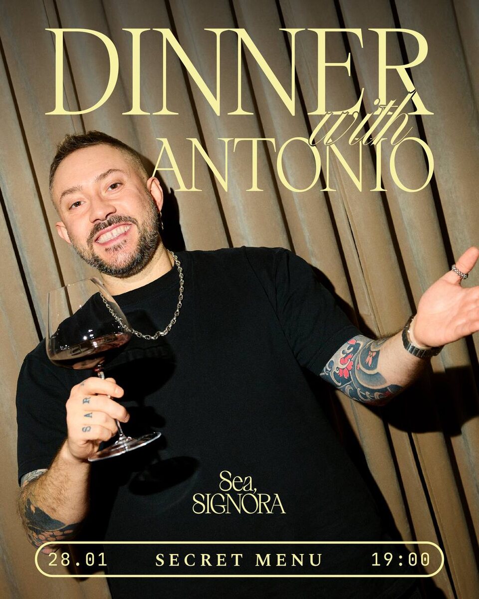 28 января в 20:00 Sea, Signora вновь станет гастрономической сценой для особенного вечера с Антонио Фреза. Антонио лично выйдет на кухню, чтобы приготовить специальный ужин для гостей Sea, Signora в тёплой, живой и по-итальянски непринуждённой атмосфере. К этому вечеру он привезёт чемодан сезонных продуктов из Милана — на их основе будет создано специальное меню с акцентом на морскую гастрономию и средиземноморское настроение. Позиции меню остаются в секрете, но Антонио умеет приятно удивлять! В качестве комплимента — бокал игристого для каждого гостя. За музыкальную атмосферу отвечает PAVLOVA — живое нео-соул звучание, которое станет идеальным дополнением к вечеру. Депозит: 10 000 ₽ с человека Большая Морская, 30 Бронирование столов: +7 (931) 357-09-92