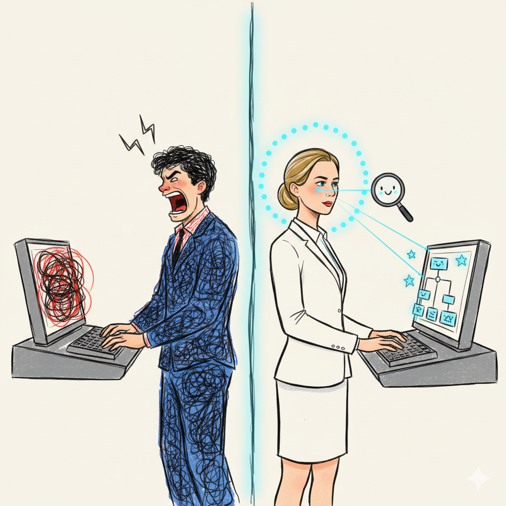 Инженеры Марк и Анна пытаются предотвратить системный сбой на заводе. До аварии — 10 минут. Марк мгновенно впадает в ярость: он кричит, бьет по клавишам и хаотично мечется между догадками. Через пять минут он багровеет от пота, его внимание размыто, а ментальные ресурсы полностью исчерпаны — его мозг не выдержал пиковой нагрузки и ушел в глубокий «перегрев». Анна чувствует тот же укол адреналина, но активирует «Резак». Её взгляд становится холодным и точным. Она мгновенно вычисляет «грязную» строку кода, удаляет её и исправляет ошибку одним нажатием. Пока Марк пытается прийти в себя, Анна уже спокойно анализирует причины сбоя. Это не магия, а разная работа их внутренней химии. 1. Искра: Направленная агрессия