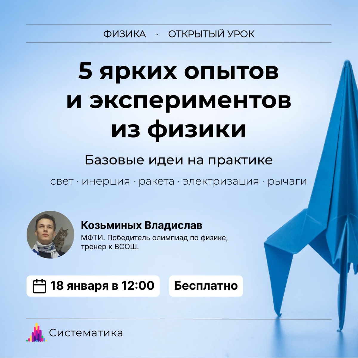 ! Приглашаем ребят 3–6 классов на открытый (бесплатный) урок по физике! Физика — это интересно! Тема: «5 ярких опытов и примеров из физики с Владиславом Козьминых» Бесплатно ➡️ зарегистрироваться 18 января (вскр) в 12:00 по мск Программа открытого урока: Что такое звук? Можно ли сделать телефон с помощью стаканчиков и верёвки, и при чем тут микрофон и микроволновка? Почему летают самолеты? ✅Соберём необычные конструкции ✅Устроим неожиданные эксперименты ✅Увидим, как физика работает в жизни Преподаватель — Владислав Козьминых — победитель и призер перечневых олимпиад по физике, автор заданий по физике, математике и статистике для школы, организатор и координатор отборочных мероприятия «Россотрудничества» на базе МФТИ. Основная наша задача познакомить и заинтересовать ребят физикой, а не загрузить знаниями. Присоединяйтесь, будет интересно!