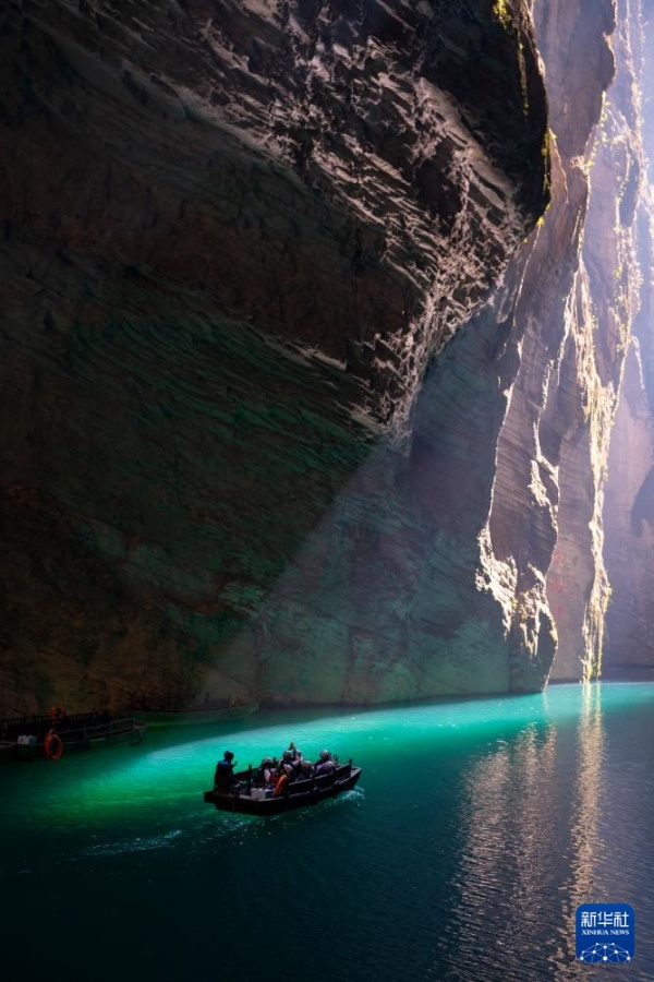 В самый разгар зимы ущелье Пиншань, расположенное в уезде Хэфэн провинции Хубэй, поражает туристов завораживающей красотой. В полдень золотистые лучи солнца пробиваются сквозь глубокие расселины и освещают ущелье, а лодки на изумрудной воде кажутся парящими в воздухе.