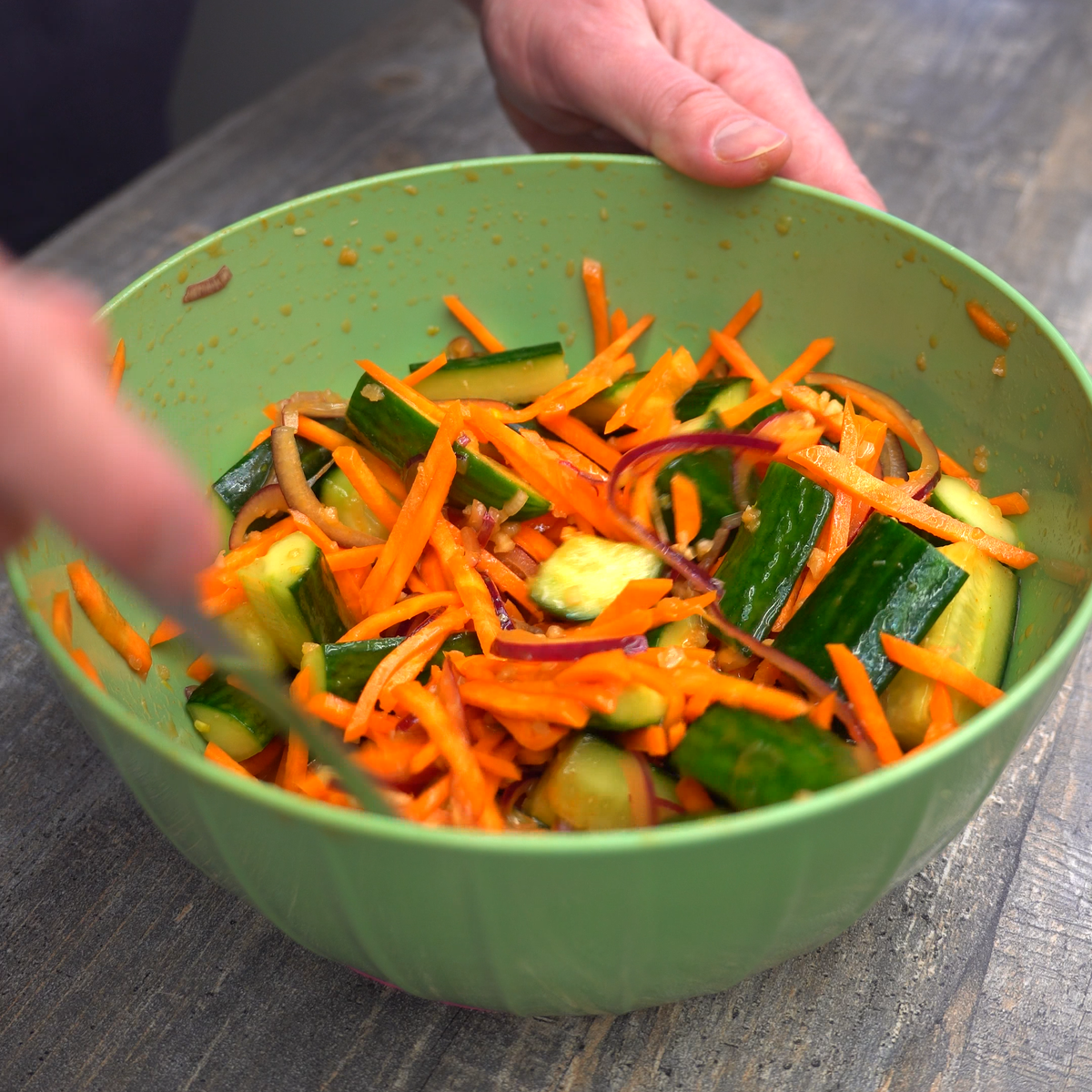 Эту закуску я готовлю, когда хочется чего-то лёгкого, хрустящего и одновременно насыщенного по вкусу. Она отлично освежает, не перегружает и подходит практически к любому блюду — мясу, рыбе, лапше или рису. В ней нет ничего сложного, но именно сочетание текстур и ароматов делает её по-настоящему удачной. Сначала подготавливаю овощи. Огурцы мою, при необходимости срезаю кончики и разрезаю вдоль на четыре части. После этого нарезаю их поперёк на брусочки длиной примерно 4–5 сантиметров. Такая форма позволяет огурцам хорошо промариноваться и при этом сохранить хруст. Морковь очищаю и нарезаю тонкой соломкой — удобнее всего использовать тёрку «по-корейски», но при желании можно нарезать ножом. Главное, чтобы ломтики были тонкими и одинаковыми. Красный лук режу тонкими полукольцами. Он мягче обычного репчатого и не перебивает вкус остальных ингредиентов. Чеснок пропускаю через пресс или очень мелко рублю ножом. Все подготовленные овощи перекладываю в большую миску. Добавляю соль, сок лимон