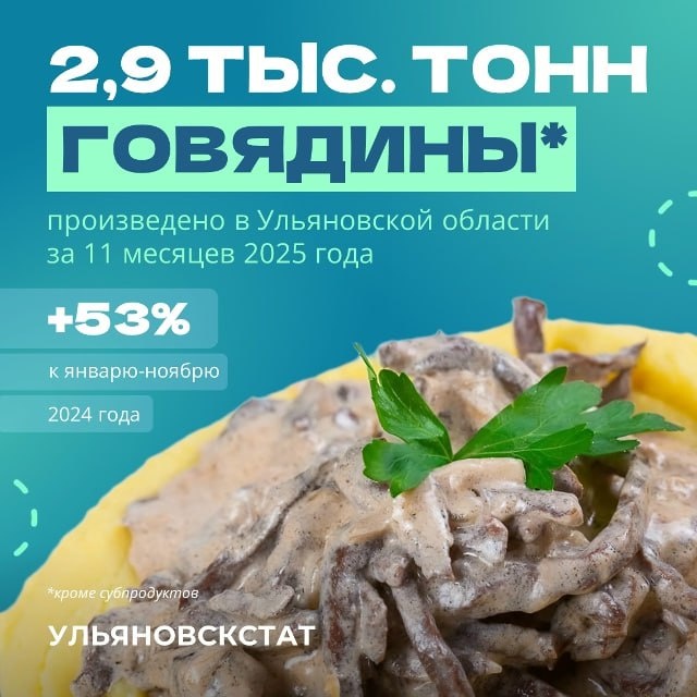 По данным Ульяновскстата за 11 месяцев 2025 года в регионе произведено 2,9 тыс. тонн говядины. По сравнению с 2024 годом этот показатель вырос на 53%. По приблизительным расчетам из этого количества мяса можно приготовить 23,6 млн порций бефстроганов Наш канал в MAX