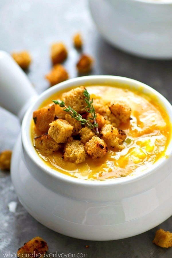 Примешать сливки и снять с огня.Подавать со свежим тимьяном и сухариками.