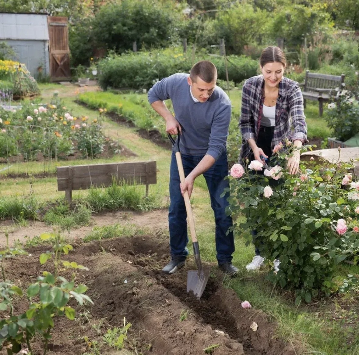Ваши розы и ваши грядки. Договоритесь, кто за что отвечает. И не забывайте иногда просто гулять по нему вместе, любуясь тем, что вырастили сообща.