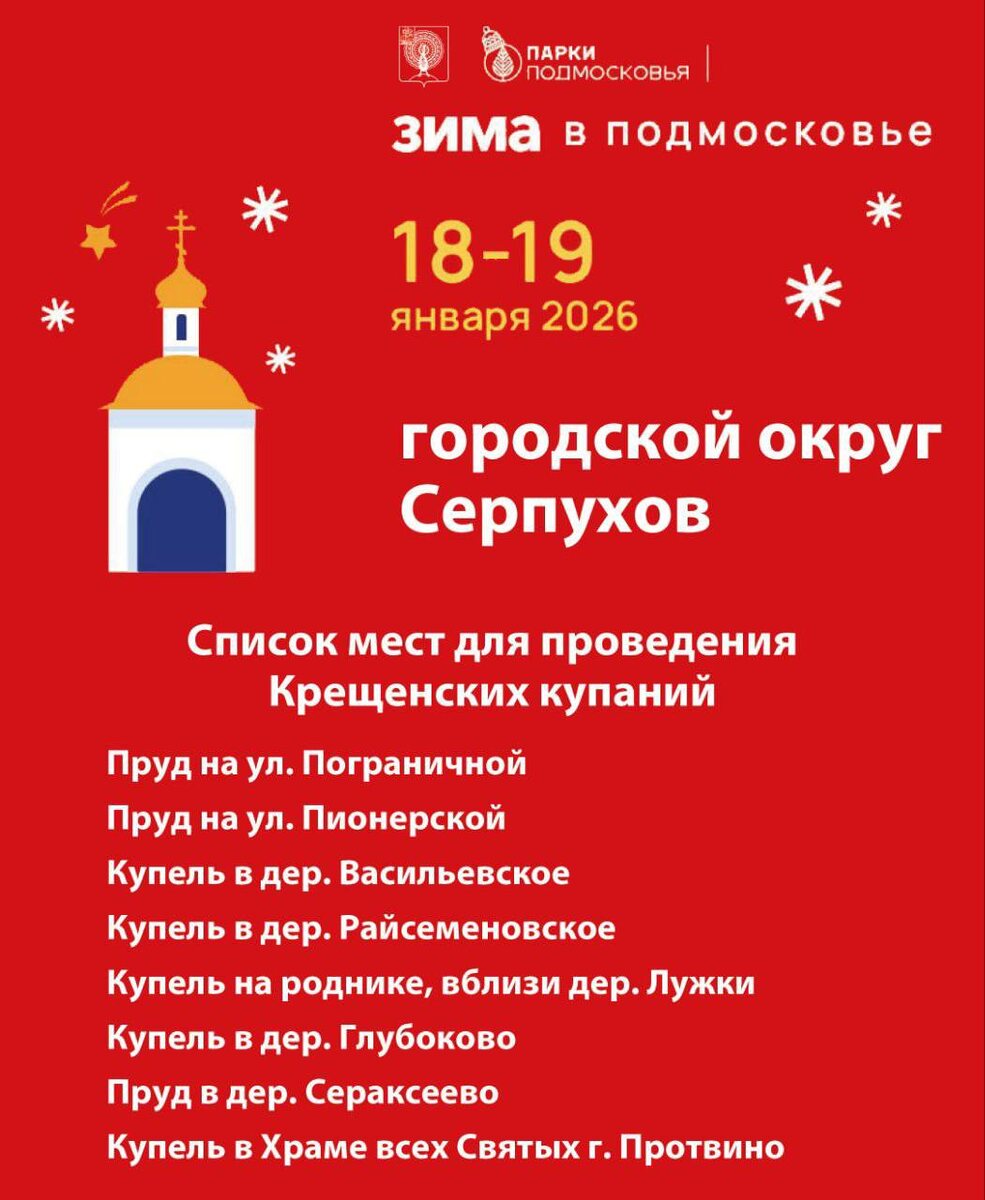 ✨ Крещенские купания 2026г. В ночь с 18 на 19 января будет организовано 8 мест для Крещенских купаний. 🔵пруд на ул. Пограничной; 🔵пруд на ул. Пионерской; 🔵купель в д. Васильевское; 🔵купель в д. Райсеменовское; 🔵купель на роднике вблизи д. Лужки; 🔵купель в д. Глубоково; д. Сераксеево; 🔵купель в Храме Всех Святых г. Протвино (будет открыта 18 и 19 января с 7:00 до 17:00). ✔️На всех площадках будут оборудованы раздевалки, пункты обогрева, а также организована бесплатная раздача горячего чая и угощений. А также расписание богослужений ⭐Поддержать канал голосом 💰 Канал Вакансии Серпухова ✅ Мероприятия Серпухов https://dzen.ru/id/66f01c6eb4c6fe60c9ca1608 http://vk.com/serpukhov_events http://dzen.ru/serpukhov_events