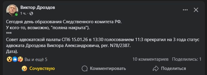 Как и обещал в новогодних планах не забрасывать тематику канала: об адвокатских войнах. Открываю (Мета-экстремистский) фсбук и первая новость в ленте - прекращение статуса адвоката Виктору Александровичу Дроздову. Экстрапрофессионала, офицера ВМФ СССР в отставке, крайне неудобного оппонента питерской Конторе, лишают статуса адвоката на максимальный трёхлетний срок. Я всегда иронично называл советы адвокатских палат резидентурами, и вот сегодня ещё одного доказательство что в шутке есть доля шутки. Виктору Александровичу, крепкого здоровья. А всем нам всё же скорейшего распространения новейших юридических технологий. Раз умные люди в адвокатуре не нужны, нужны только лояльные. Ну пусть у людей будут хотя бы компьютерные юридические ассистенты, которым статус адвоката не нужен. #адвокатские_войны #лишение_статуса