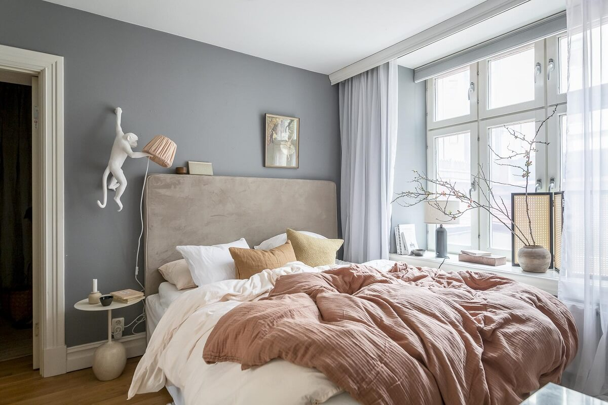 — если окно с поворотной створкой — учитывайте амплитуду ее открывания (часто створка бьет по тумбочке). Удобный подход к кровати — это 70–90 см. Многие же оставляют 30–40 см, думая «протиснусь».