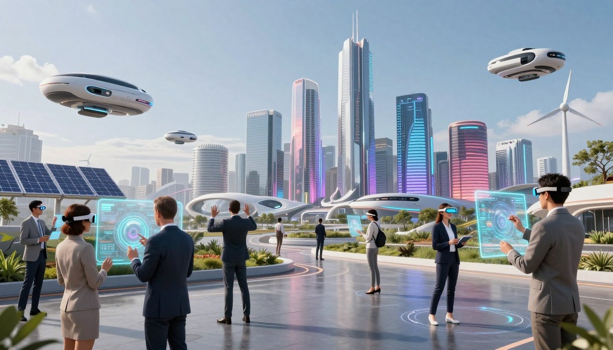 Футуристическая сцена с применением дополненной реальности: профессионалы взаимодействуют с голографическими интерфейсами