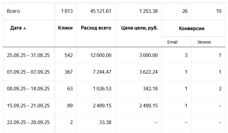 В конце запускаем новые РСЯ-кампании, поэтому количество кликов резко растёт, а стоимость клика снижается, но заметим что цена конверсии в космос уже не улетает как в начале работы.