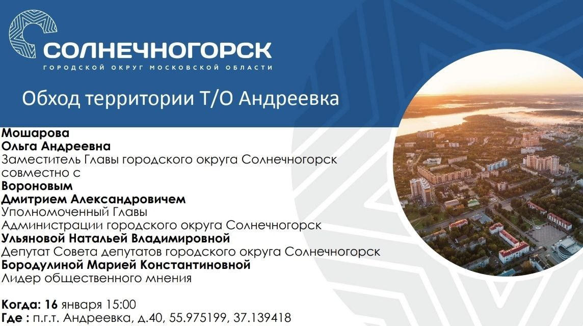 В пятницу, 16 января, в Андреевке пройдет открытый для местных жителей обход территории поселка солнечногорскими чиновниками: замглавы