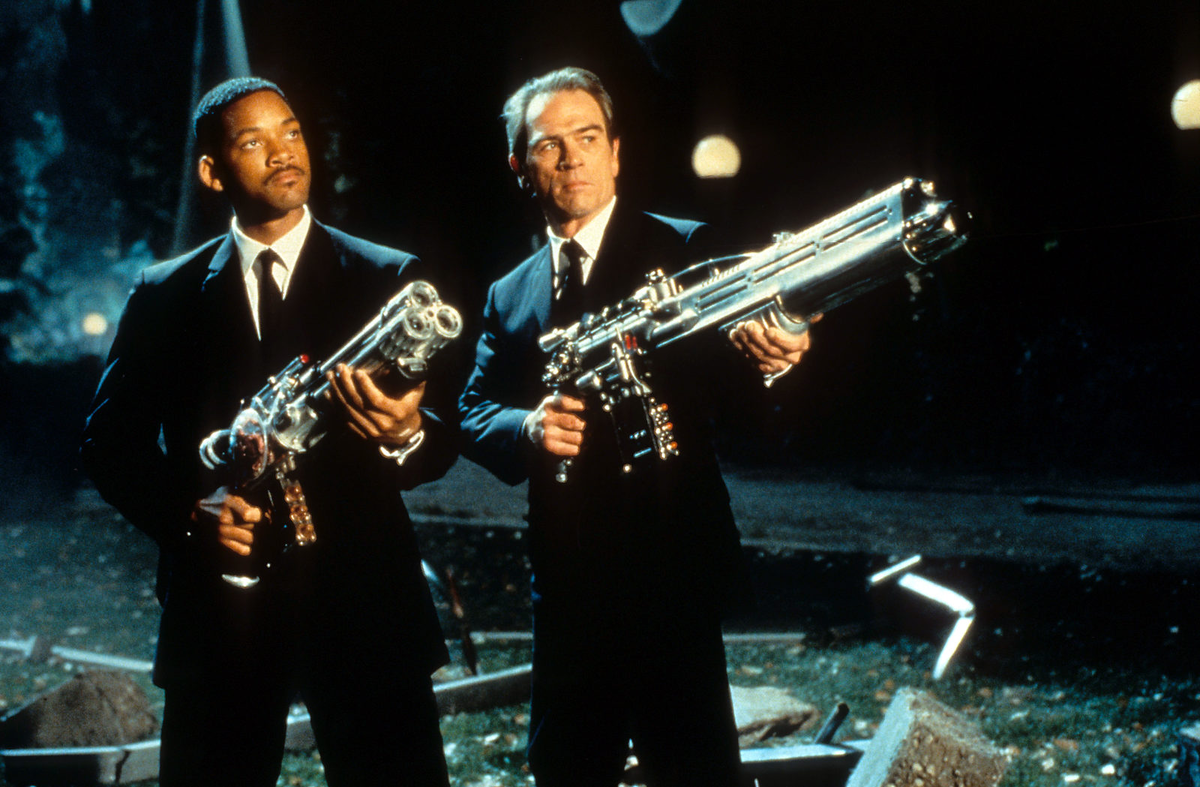 Люди в черном / Men in black. США, 1997. Режиссер Барри Зоненфелд. Актеры: Т. Ли Джонс, У. Смит и др. Эта фантастическая комедия - по праву - один из рекордсменов американского проката 1997 года. Фильм не только принес фантастическую прибыль, но и стал источником дополнительных доходов по продаже темных очков, специальных маек, одеколона и других "сопутствующих" товаров... Казалось бы, сейчас очень трудно придумать что-то новенькое про инопланетян, но, это, как выяснилось, не касается Барри Зоненфелда. Мэтру киноразвлечений удалось с техническим блеском реализовать все сложнейшие превращения "чужих", которых, оказывается, полно на нашей планете, но знают про это только таинственные "люди в черном". Вот их-то и играет в картине замечательный дуэт Томми Ли Джонса и Уила Смита. На мой взгляд, Джонс блестяще повторяет опыт знаменитого комика великого немого Бастера Китона, который в своих безумно смешных комедия никогда не улыбался. А Уил Смит еще раз доказал, что является сегодня самым с