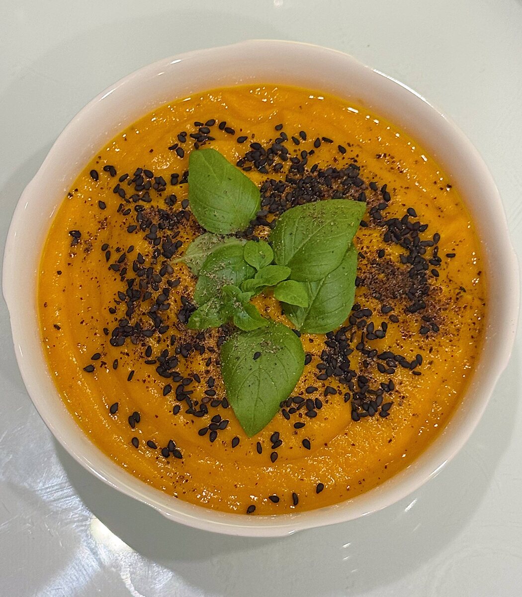 Отлично подходит на обед или ужин. Идеально в пост. Готовьте, когда не хватает радости или для восстановления жкт после долгих праздников 😊 Готовится очень просто в 4 этапа: 1. Приготовить на пару тыкву и батат (примерно 3:1, но на ваш выбор). Мы готовим овощи в кастрюле-пароварке на плите. 2. Измельчить вареные овощи в пюре, добавив немного овощного бульона. Можно это сделать блендером или в измельчителе. Пюре выложить в кастрюлю. 3. Влить 250 мл кокосового молока (Aroy-D). Добавить специи (больше-меньше, на ваш вкус): 1 ч.л. молотого имбиря 🫚 1/2 ч.л. копченой паприки 🌶️ 1/2 ч.л. карри 💛 1/2 ч.л. сухого чеснока 🧄 соль 🧂 Аккуратно перемешать, довести до кипения и подержать 3-4 мин. По желанию добавить свежий давленый чеснок. 4. Выложить суп-пюре в тарелку, украсить листочками базилика 🌿 (кипрского) и кунжутом. Добавить по вкусу молотый черный перец. Приятного аппетита! 🧡 #душистыерецепты #живиорганично #ягоднаяферма #душистыйлуг #таруса #полезнаяеда