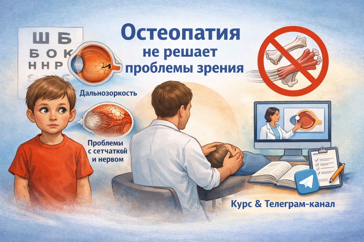 Косоглазие — это не самостоятельное положение глаза «не на своём месте» и не следствие локального мышечного или костного нарушения. Отклонение глаза всегда имеет конкретные офтальмологические причины, связанные с формированием и функционированием зрительной системы. В большинстве случаев косоглазие развивается как следствие: При этих состояниях глаз отклоняется вторично, в ответ на нарушение качества зрения или невозможность полноценного бинокулярного взаимодействия. Иными словами, косоглазие является следствием, а не первичной механической проблемой. Остеопатия не оказывает влияния ни на рефракцию глаза, ни на состояние сетчатки, ни на функцию зрительного нерва, ни на процессы формирования бинокулярного зрения. Остеопат не располагает инструментами, позволяющими объективно оценить зрительные функции ребёнка, выявить истинную причину косоглазия или проконтролировать динамику лечения с офтальмологической точки зрения. Анализ заявлений об «успешном лечении» косоглазия с помощью остеопа