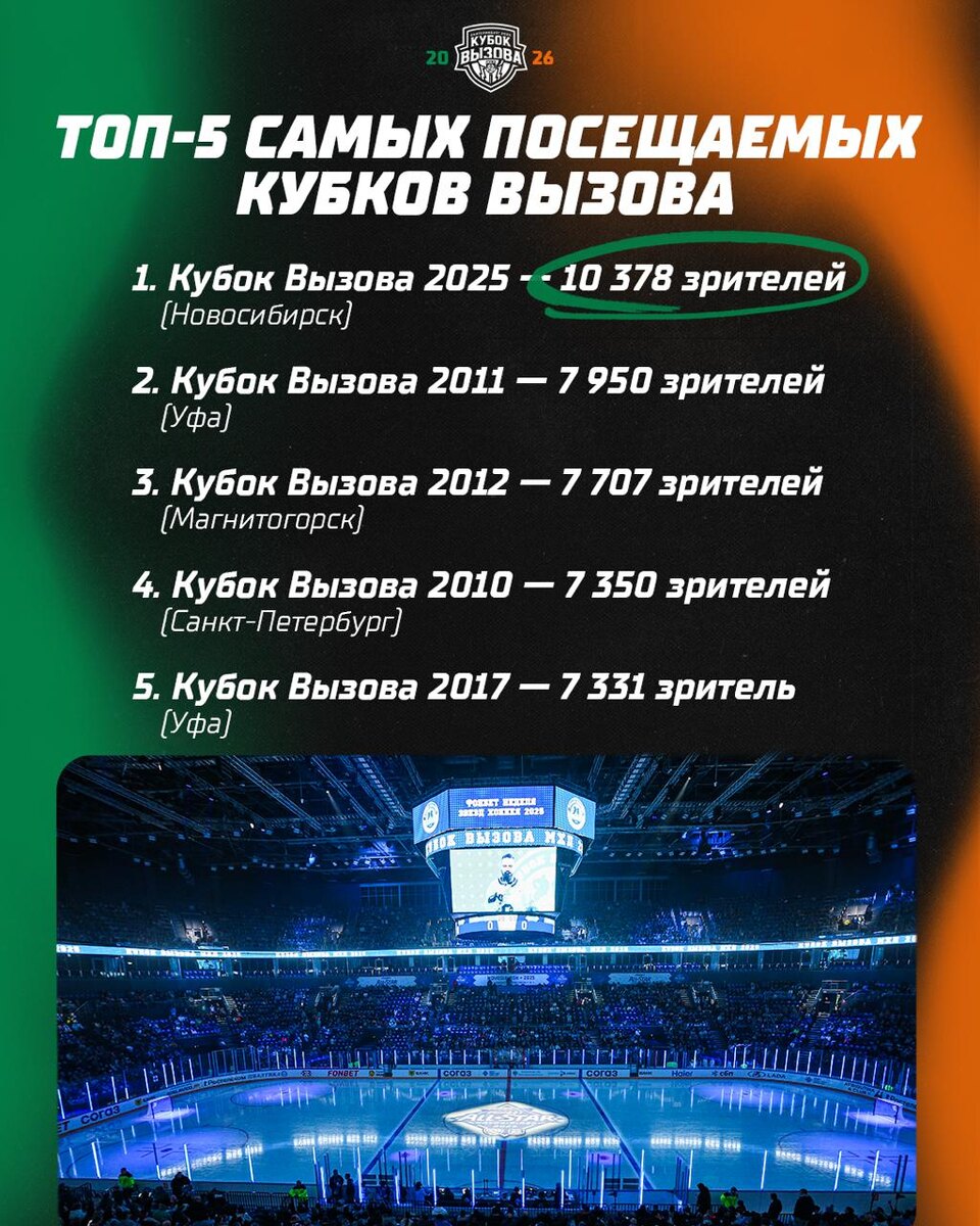 ! 6️⃣ февраля 2️⃣0️⃣2️⃣6️⃣ года в Екатеринбурге пройдёт 15-й Кубок Вызова. Лучшие игроки МХЛ сыграют на «УГМК-Арене» вместимостью 1️⃣2️⃣ 5️⃣8️⃣8️⃣ зрителей. Сможет ли Екатеринбург побить рекорд своего предшественника? В Новосибирске матч лучших молодых игроков посетили 1️⃣0️⃣ 3️⃣7️⃣8️⃣ болельщиков. 🎫 allstarweek.com | «Яндекс Афиша» #КВ2026 🏒@mhlrus