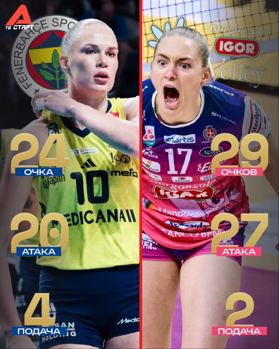 ! Матч «Фенербахче» – «Новара» превратился в противостояние бомбардирских талантов Толок и Федоровцевой. Личную дуэль Татьяна выиграла, набрала 29 очков против 24-х у Арины, но итальянская команда в итоге уступила турецкой в пяти сетах (20:25, 25:22, 25:12, 20:25, 15:10). Теперь стамбульский клуб оторвался на четыре очка от «Новары» в борьбе за прямую путевку в 1/4 финала Лиги Чемпионов 🏆 Подписывайся на ТВ СТАРТ в MAX📲