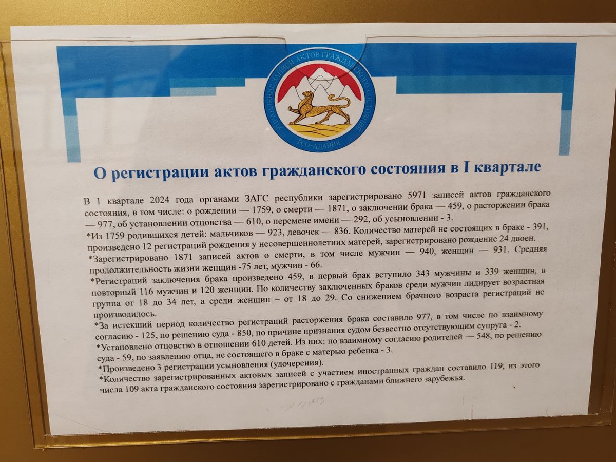 Из этих данных ясно, что установление отцовства по взаимному согласию родителей происходит в 10 раз чаще, чем по решению суда. Это свидетельствует о том, что даже без официального штампа в паспорте мужчины в Осетии склонны добровольно брать на себя юридическую ответственность за детей. Подавляющее большинство разводов (87%) происходит через суд (то есть в семьях есть дети). Всё это указывает на то, что люди массово используют развод как способ получения финансовой поддержки от государства в условиях сложной экономической ситуации. Женщины в республике склонны создавать семьи раньше мужчин. Пик регистраций у женщин заканчивается к 29 годам, в то время как мужчины активно женятся до 34 лет. После этих возрастных порогов активность резко падает. Примерно 25% всех новых браков — это повторные союзы (116 мужчин и 120 женщин). Это позитивный тренд, указывающий на то, что люди не теряют веру в институт семьи после первого неудачного опыта. В целом, главной демографической угрозой для Осети
