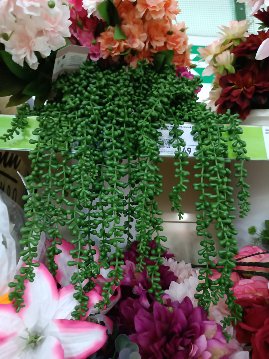 Начну с декоративных растений для украшения интерьера. Зеленые ветки-висюльки увидела, очень яркие и симпатичным ковром свисающие. правда, они не такие "фотогеничные" ))) В магазине на деле смотрятся лучше, чем на моих фото. Возможно, это как эффект визализации на расстоянии. Как с картинками художников, которые советуют смотреть не вблизи, а исключительно на определенном расстоянии.