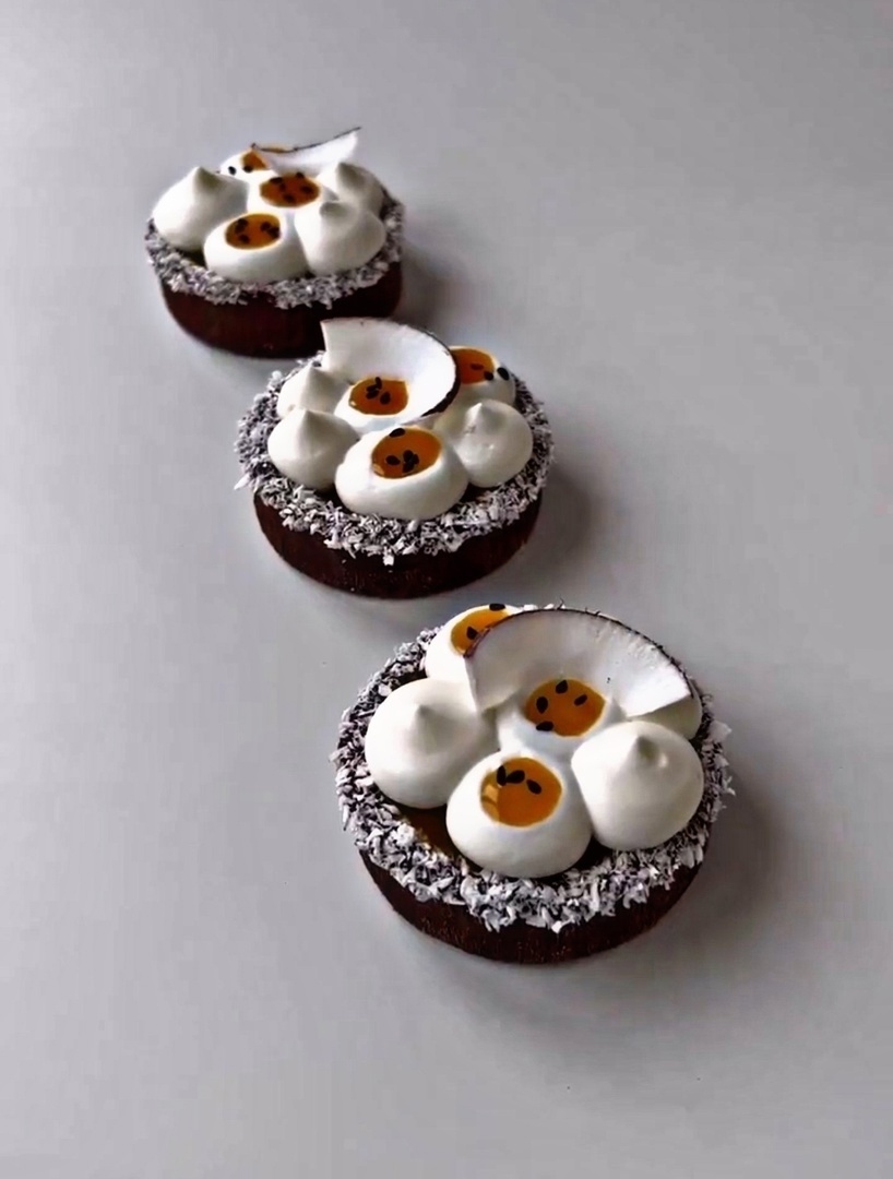 Желатин залить водой в соотношении 1:6. Сливки (1) и кокосовое молоко нагреть. Ввести шоколад и желатиновую массу, сделать эмульсию блендером. Добавить холодные сливки, ещё раз пробить, накрыть пленкой «в контакт» и оставить на 8 часов для стабилизации. Взбить, отсадить сверху тарталеток.