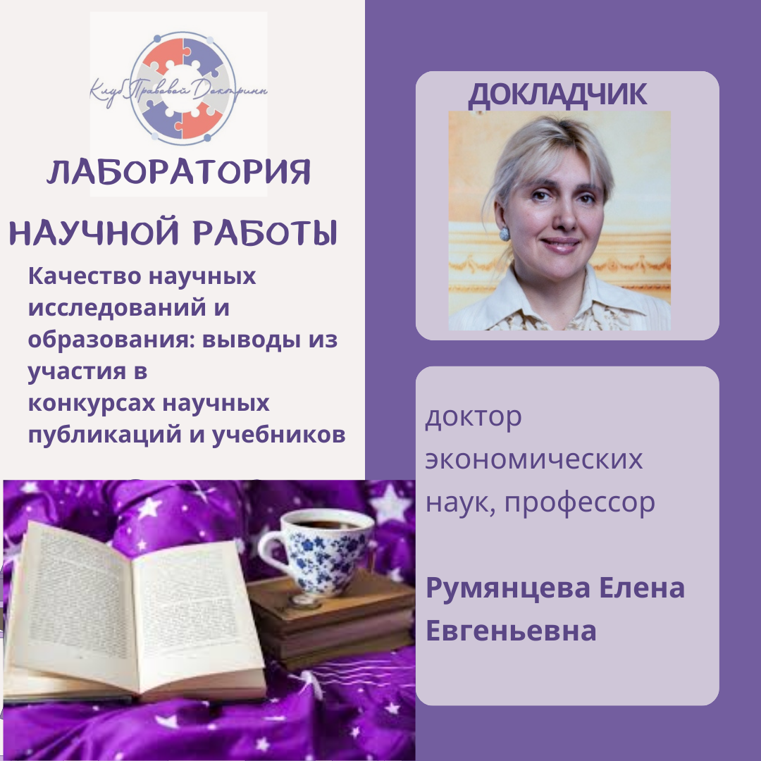 Продолжаем работу Лаборатории научной работы Клуба Правовой Доктрины 17.01.2026 в 19 часов. Проф. Румянцева делится опытом научной и экспертной работы Регистрация на выступление проф. Румянцевой 18.01.2026 https://forms.yandex.ru/cloud/696917b4eb6146136c2a2976 Публикация автора с материалами для обсуждения данной темы (в открытом доступе): Румянцева Е.Е. Об унификации содержательных требований к проведению научных исследований и их независимой экспертизы // Социальная интеграция и развитие этнокультур в евразийском пространстве. 2022 Т. 1 № 11 С. 228-233.https://www.elibrary.ru/item.asp?id=49826597