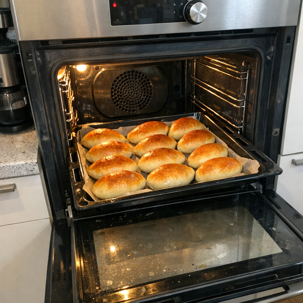 Пирожки пекутся около 20–25 минут, всё зависит от духовки. Ориентир один: ровный золотистый цвет верха и боков. Готовые пирожки сразу перекладываю с противня на решётку или на чистое полотенце. Если накрыть их тонким полотенцем на 10 минут, верх получится мягким, а низ не отсыреет.