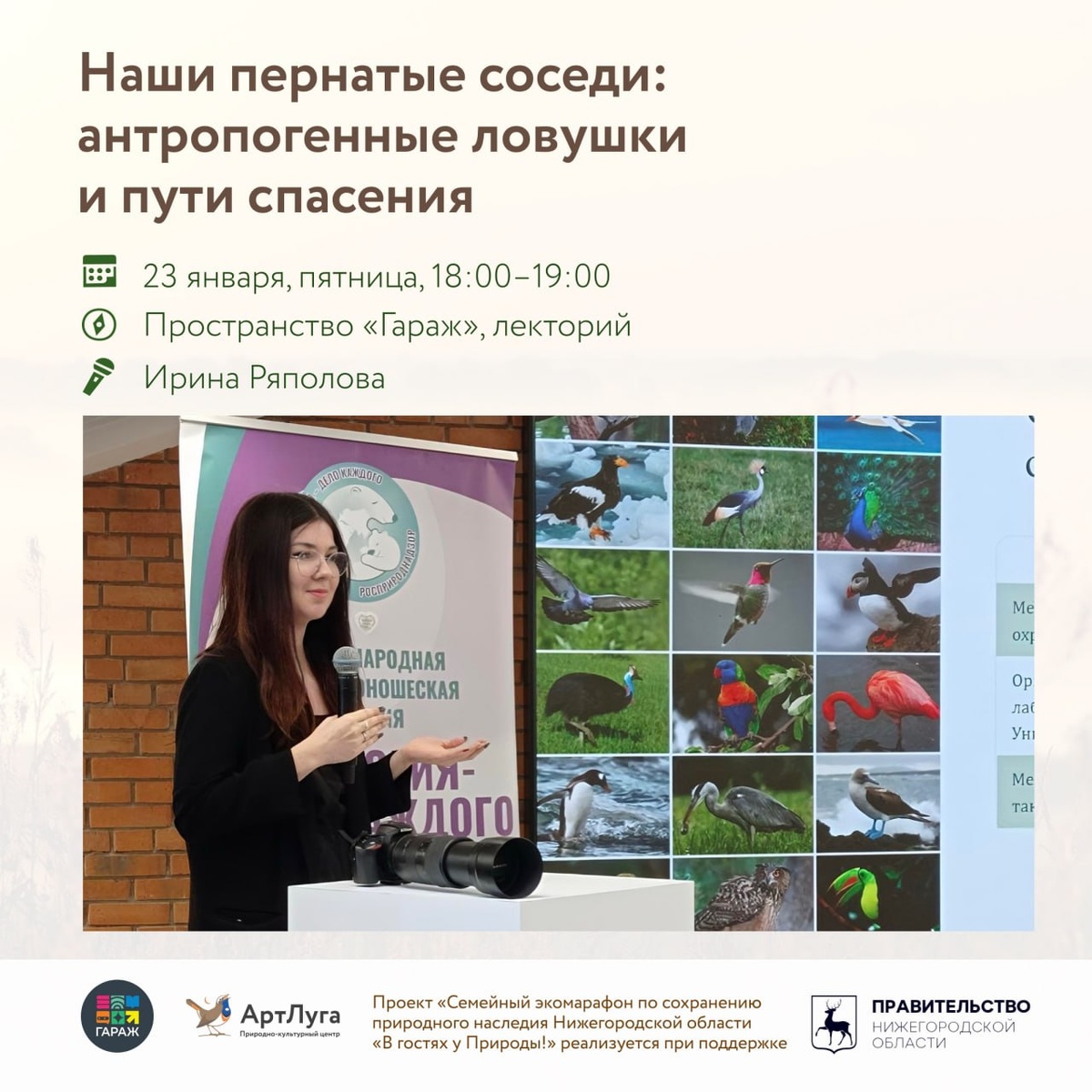 ! Приглашаем на лекцию «Наши пернатые соседи: антропогенные ловушки и пути спасения», где мы разберёмся, как живётся птицам в мегаполисе и что мы можем сделать для их безопасности. Мероприятие пройдет 23 января (пятница) с 18:00 до 19:00 в пространстве Сбера «Гараж», зона «Лекторий». На лекции поговорим о том: · Сколько видов птиц обитает в городе и как меняется их жизнь рядом с человеком. · Неочевидные городские опасности — от окон-невидимок до домашних животных на самовыгуле. · Как птицы меняют окрас, питание и пение в условиях мегаполиса. · Простые и эффективные правила, которые помогут не навредить, а помочь нашим пернатым соседям. Лекцию проведёт Ирина Ряполова — орнитолог и фотограф-анималист. Мероприятие бесплатное, но по предварительной регистрации. Количество мест ограничено. Зарегистрироваться: vk.cc/cQyHR6 Важно! Регистрируйтесь на мероприятие, только если уверены, что сможете его посетить. В случае непредвиденных обстоятельств просим сдать билет и дать возможность прий