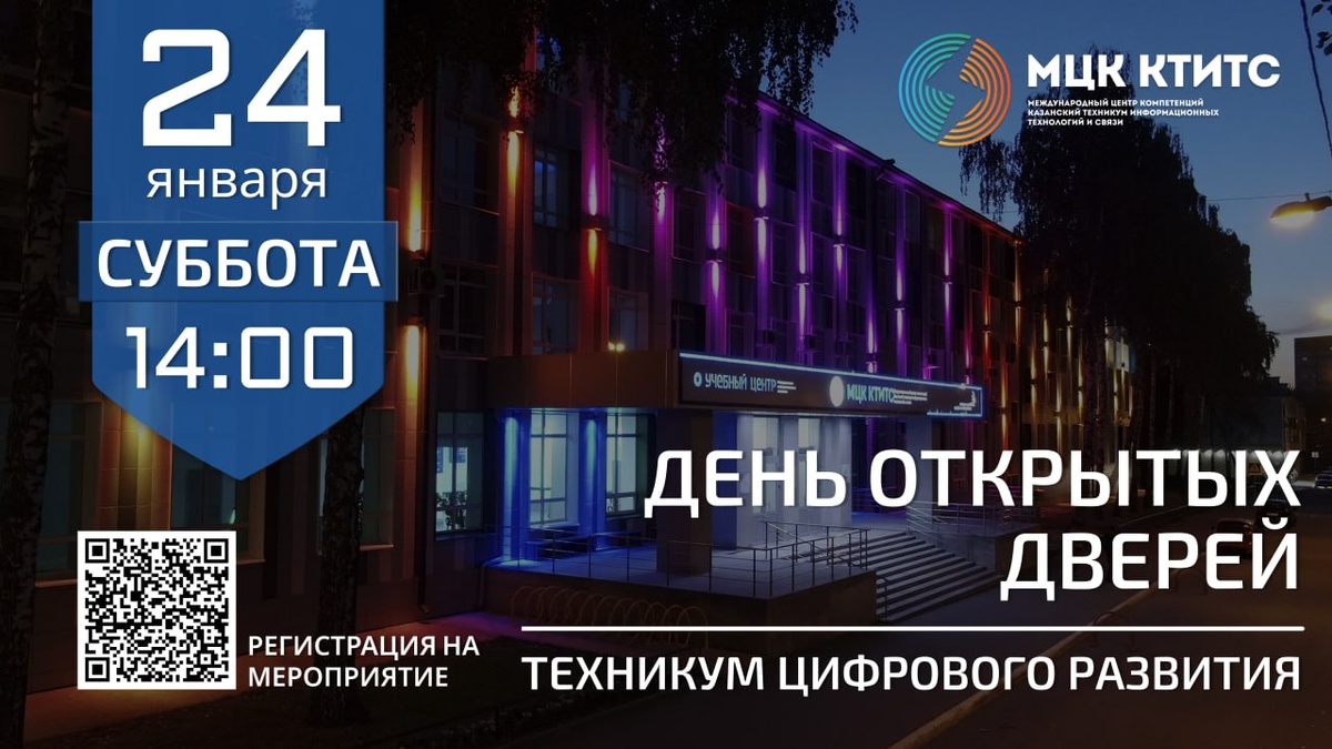 ! Государственное автономное профессиональное образовательное учреждение «Международный центр компетенций — Казанский техникум информационных технологий и связи» приглашает Вас на День открытых дверей, который состоится 24 января в 14:00 по адресу: г. Казань, ул. Бари Галеева, д. 3а. Проезд городским транспортом, остановка Советская площадь. 🚌🏫 Вы узнаете историю техникума и о достижениях его выпускников. Получите исчерпывающую информацию об условиях приема и обучения, программах дополнительного образования, о специальностях, учебных планах, практике, трудоустройстве и многом другом. 📚🎓 А ещё вы получите самый полный гайд по поступлению от приёмной комиссии, в котором: • все направления обучения; • важные даты для поступающих; • инструкция по онлайн подаче документов; • стоимость обучения; • и многое другое. 📝💡 Также гостей ждет отдельная презентация Центра цифрового образования детей «IT-куб», работающего на нашей базе. Вы узнаете о современных программах IT-творчества